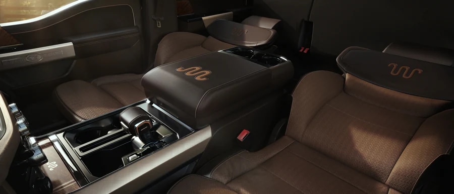 No more signing contracts on your buddy's back. With the available Interior Work Surface, your F-150® interior is also your go-to office. Stow the shifter so a table can unfold directly from the center console or, with the bench seats, pivot the Interior Work Surface toward you and get to work. Sign documents, open up your laptop or grab a quick lunch break.