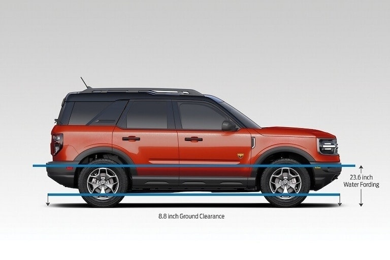 Bronco® Sport Badlands® SUV with optional equipment shown. Always determine the water depth before attempting a crossing and proceed slowly. Refer to your Owner's Manual for detailed information regarding driving through water. Extra-cost color option. Computer-generated image shown.